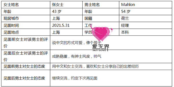 张女士来自上海,她认为国外的伴侣更注重感情的沟通,对离异女士和孩子的接受度更高,于是选择来到了爱无界。在这里,她开启了寻爱之旅,结缘了不少优质的外国男士。这一次,张女士和荷兰的Mahlon见面了,这位男士又能不能获得她的芳心呢?