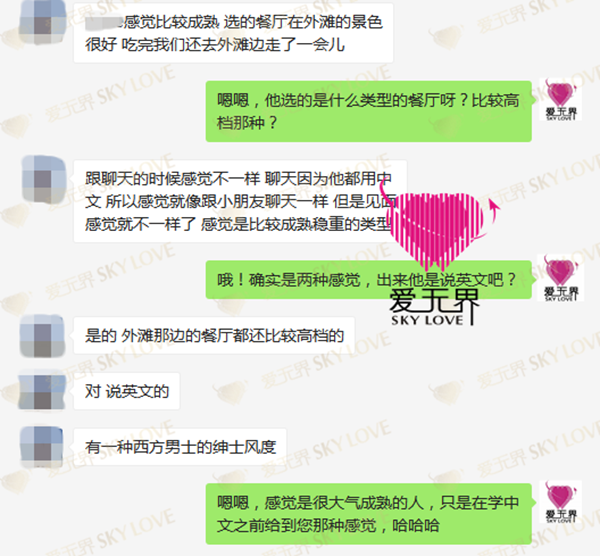 见面前,Mahlon就不需要张女士操心约会地点,自行研究了张女士当地的餐厅,选择了一家有格调又有质量的高档餐厅。在见面当日,Mahlon更是预留了充足的时间,❀提前抵达等待张女士下班赴约。两人愉✤快用餐后就在江边散步,用英语交流着彼此的见闻和想法,与对方分享一些学习语言的技巧和建议。整个见面的过程,张女士能感受到Mahlon的成熟稳重,和西方男人的绅士风度。