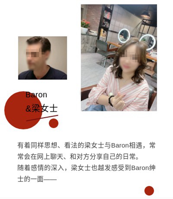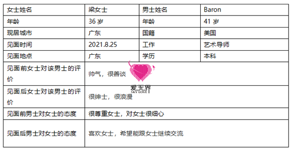 梁女士来自🃏广东,是一位随和豁达的女士,她热爱旅游和社交,喜欢去探索全新的地方,结识不同国家的朋友。在情感导师的陪伴下,她遇见了Baron,一位英俊、聪明且善良的美国男士。Baron外形很帅,✤身高有190,从事艺术类表演导师,喜欢各种类型的音乐和各种形式的艺术与文化,也热衷于去探索各种新的可能。