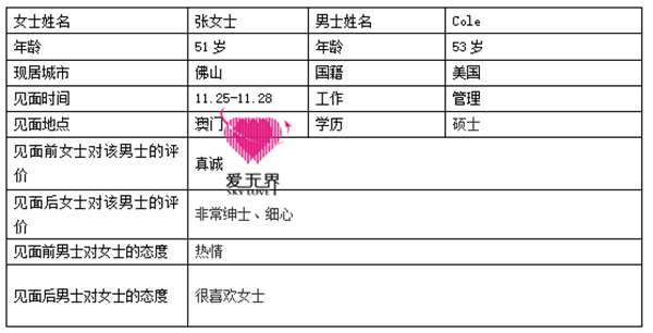 美国的Cole比张女士仅年长两岁,从一开始,他的态度就很真诚,告诉张女士自己是希望找位女士🃏去爱的。在一天又一天的聊天中,Cole对张女士也是越𓆉发的喜欢,热情地和她分享自己的生活,还询问她什么时候方便见面。