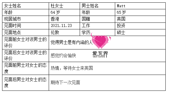 这让杜女士觉得Matt不仅性格绅士,还非常认真有态度,总体评价不错。期待杜女士之后在英国的见面之旅~