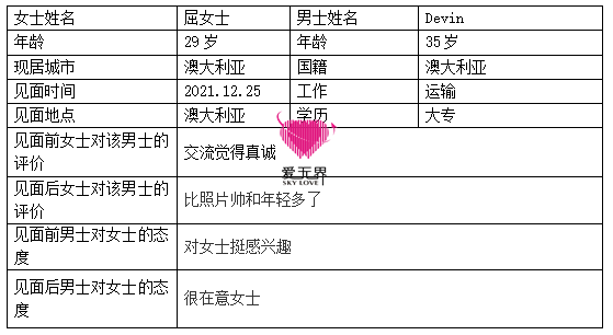 Devin是一个有爱心、诚实又主动的澳大利亚男士,从第一眼见到屈女士,他就很积极地和她聊天,在日后的交谈中💞,对她是越发感兴趣,总是主动和屈女士分享自己的生活、工作、家人和成长的经历。一天天的交流下来,屈女士亦能感觉到Devin的真诚。