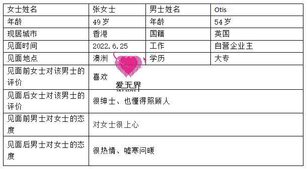 见面对象Otis是英国人,现在澳洲生活,并在那拥有ꦏ了自己的汽车维修店,没有经济压力,又懂得享受生活,是一位很有闲情逸致的男士。Otis喜欢享受浪漫,张女士同样是个浪漫有仪式感的人,两人志趣相投,每天都聊🥀得火热,恨不得早点见面对方。