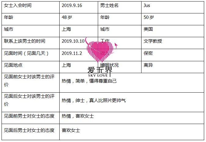 🥂 刘女士深谙其道,在追爱的路上,从不放弃每一次和西方男士见面的机会,不放弃每一个能够自我提升的情缘,2019年10月,她在爱无界邂逅美国文学教授Jus。