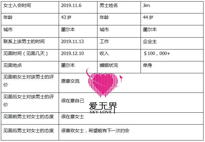 🅷 Jim今年44岁,是一位成功的企业主,在爱无界平台上结识Coco之后,才发现两人的距离如此之近,都在墨尔本,从未有过这种心那么绷紧的感觉,Jim的内心有些激动,迫不及待想要听一听这个来自东方的女士的声音,小心翼翼地提出要求,希望能和Coco通话一番。征得Coco同意之后,服务组把Coco的手机号码发给了男士。