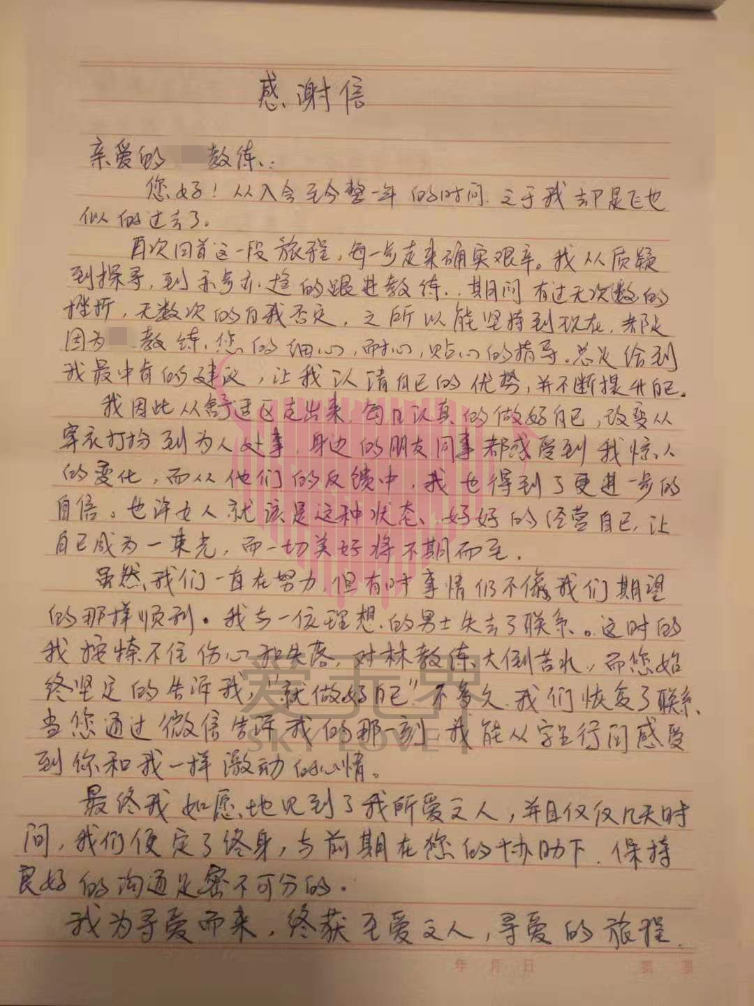 再次回首这一段旅程,每一步走来确实艰辛。我从质疑到探寻,到亦步亦趋的跟进教练,期间有过无数的挫折。无数次的自我否定,之所以能坚持到现在。都是因为×教练您的细心,耐心,贴心的指导。总是给到我最中肯的建议,让我认清自己的优势,并不断的提升自己。