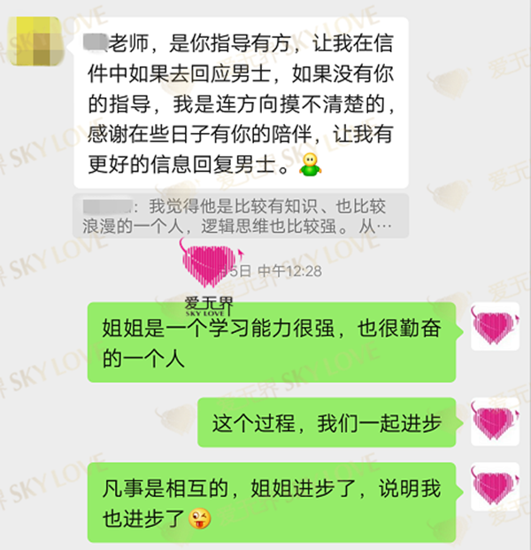 ♔ 一段时间后,刘女士基本知道如何跟男士交流和促进感情。她从开始时每一步都要问情感老师该怎么回答,到完全可以自己应对跟男士的交流,只是偶尔遇到比较棘手的问题,才需要咨询情感老师。