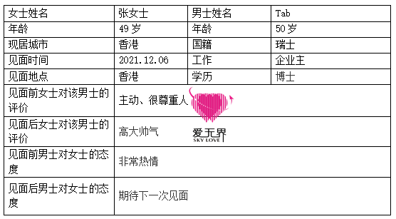 12月6日,张女士和Tab一起到了咖啡厅。Tab对这次见面很重视,♒穿着西装的他显得高大又有安全感。事后,张女士还跟情感老师笑言自己的心突突突地在狂跳。坐到一起,喝咖啡已经是次要的了,两人都迫不及待地和对方分享自己。Tab对张女士很坦诚,和她说着关于自己的一切,再琐碎的小事,因为是和对方说的,都觉得有意义。见面要结束时,Tab有些依依不舍,和张女士一起拍照留念,又表示下次一定要继续见面,希望可以有更多充裕的时间来相处。