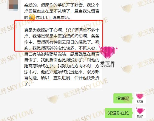 此后,梁女士果真改变了很多🍎,非常配合情感老师的指导,任何进展都第一时间汇报情感老师,遇到困难时主动寻求情感老师帮助,与情感老师细细分析,坦诚说出自己的想法和对男士的看法,听取情感老师的建议!