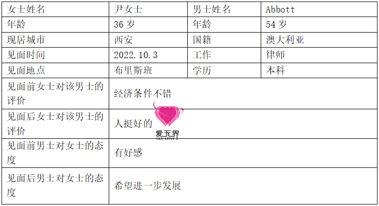 所以,在见完面之后,在Abbott的积极追求之下,尹女士也坚定自我。她知道,她在爱无界还有很多的机会,她还想多尝试,在和西方男士交流相处中找到最适合自己的灵魂伴侣,爱无界期待尹女士成功找到自己幸福的那一天~
