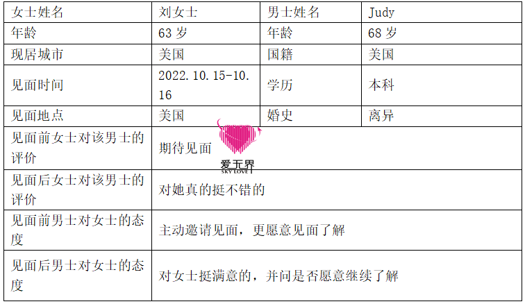而刘女士🍸,也在与Judy的一次次见面中逐步掌握跨国交友的秘诀。对她来说,在爱无界她还会有很多选择的机会、接触到不同的男士。