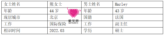 Harley43岁,是一位副主任,硕士学历,为人真诚富有爱心,又很有见识和智慧。两人相识于2022年3ꦗ月初,交流之后发现有很多相似的地方,比如都很爱孩子和愿意照顾家庭。他们就像是世界上的另一个自己,聊天谈心亦总在同一个频道上。