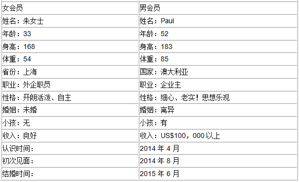 ﷺ 年轻时尚的朱女士在与澳洲的Paul第二次见面之后定下了2015年1月结婚的计划。自2014年8月见面后,分隔两地的一对恋人已无法忍受长期的分开,于是2014年的11月,Paul迫不及待地又飞过来上海了,向朱女士求婚,安排订婚宴,宴请朱女士的亲朋好友!