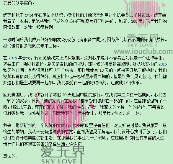 2016年7月20日,已经成功的会员吴女士给教练发来了她的先生Frankie写给美国领事馆领事官员的信,是为妻子吴女士申请办理未婚妻签证提交的信。Frankie𒁏是一位律师,这次关于吴女士来美国的签证,他没有让任何公司代理,而是从头到尾自己操作,与吴女士一样一样地沟通,这让吴女士的英语迅速提升的同时,还学了不少签证知识!