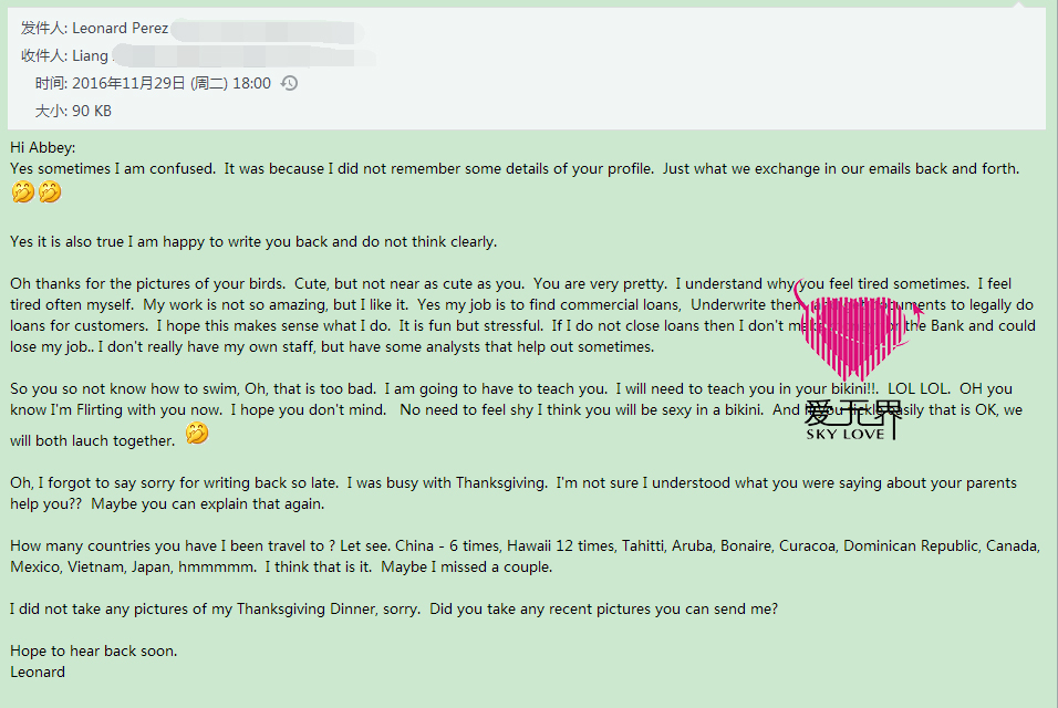备注:男士今年55岁,来自美国,女士31岁,来自广东广州,两人从11月份的月初开始联系上彼此,由于女士青春亮丽的装扮,加上女士的幽默风趣的性格很是吸引男士,在通过邮件中的来往信件中,男士对女士表达的爱意越发浓烈,也曾不自信的问女士是否真的喜欢他,几次的向女士确认真实的年龄,因为双方的年龄差距有些大。但是女士对男士也很是喜欢,所以并不介意彼此间的年龄距离,只要两人是情投意合,年龄并不会成为两人情感发展的阻碍。期待双方的甜蜜进展哦!