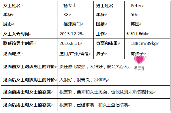 ꦯ 杨女士也为自己的身材懊恼,但是对婚姻和爱情的渴望让她坚定要走国际婚姻。2015年12月28日,杨女士把对婚姻幸福的寄望交给了爱无界。