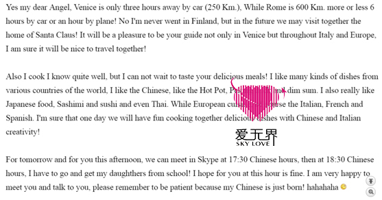 🐬备注:男士来自意大利,54岁,女士来自重庆,41岁。男士是一个风趣幽默,积极乐观,温柔浪漫的人。每次的来信,都充满热情与激情,很容易带动对方的情绪,走进心房。男士经营自己的一家餐厅与酒店,本来预期2月底百忙抽空来重庆看望女士,但由于身体突然出现了一点小状况,所以会推迟。男士也询问女士是否愿意来意大利见面并担负来回机票费用,一切正在酝酿发展中...