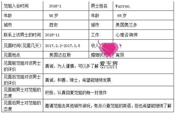 💎 初登平台,范姐的情感之路并不是一帆风顺,因为各种各样原因与多个男士擦身而过。虽然有遗憾,但范姐并没有气馁,和教练分析原因后,调整好心态,提升自己,等待自己的缘分。2016年的11月,范姐认识了来自美国奥兰多男士Warren,刚接触范姐对于1米75的Warren,并没有怦然心动的感觉,虽然教练和翻译一致认为Warren有诚意,可以交流了解的。在接下来的通信中,Warren也表现出谨慎的一面,但很认真回复范姐的每一封信件。一个多月通信时间,范姐也被慢慢被这真诚的男士所感动,开始期待着两人的见面。