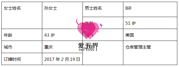 𓆉 2016年4月上旬,爱无界教练向孙姐推荐了来自美国的Bill,他用他的真诚、体贴、细心套住了孙姐的心,他们的幸福故事就此展开了。