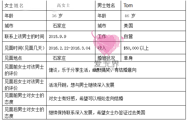 2014年8月28日加入爱无界꧋,起初她觉得自己是一个大龄青年,一直都不够自信,错失了很多与男士交往的机会,经过情感教练的建议与指导。在2015年♑9月1日,在平台上遇到了来自美国47岁的Tom,上天总会眷念善良美丽的女士,美丽的邂逅,高女士的真命天子带着真诚的心来到了她的身边,他们的爱情故事,就这样展开了……