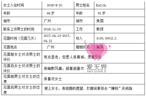 ꦚ 情感教练向陈女士推荐了来自美国51岁的Keith,Keith是一位大学教授,温文儒雅,为人真诚。两人在交往了第三个月时,陈女士的善良和真心打动了Keith,Keith定下了2017年4月13日在广州见面的行程!