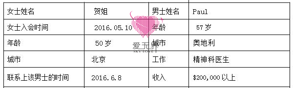 🌌 贺姐在2016年5月入会时49岁,遇见了来自奥地利的56岁Paul,Paul是一名精神科医生,也是位运动达人,身体非常健康,身材也保持得很好!两人经过两个月的沟通,在2016年7月16日见面!