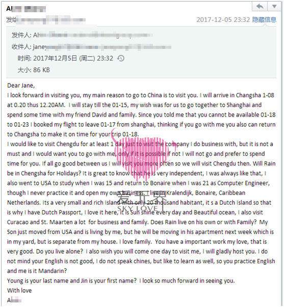 🔥备注:该男士是荷兰博内尔人,54岁,身高180cm,大学本科毕业,是一家公司的CEO,精通英语,荷兰语,西班牙语和意大利语。女士Jane,45岁,来自湖南长沙。男士非常喜欢女士,特别真诚。男士非常期待与女士见面,并且很希望以后能与女士幸福的走下去。