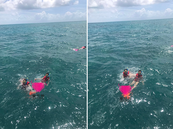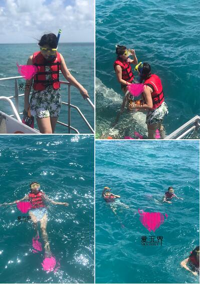 ജ 开始浮潜啦!!几位姐妹晕船啊,可受不住清澈海水的诱惑,穿戴装备下海啦!