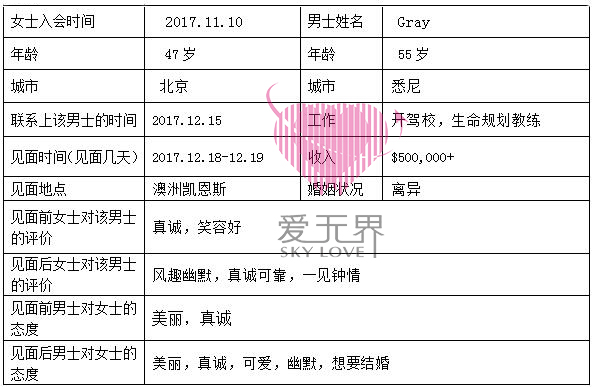 ♎爱无界寄语:如果你觉得对自己的感情世界无能为力了,不要着急,也许你缺乏的并不是一段感情,而是一个全新的自己。悉尼非凡爱之旅让Mary收获的并不仅仅是一段怦然心动的爱情,更重要的是在爱无界专业团队的帮助下让Mary的整个心态得以调整到最佳的状态,无论是语言上还是爱情上让Mary重获自信。甚至可以像教练学习去帮助同行的其他姐妹,向她们传播正能量。这种转变基于教练耐心的指导和女士走出去、看世界的勇气。勇敢、信任、付出、配合、感恩让Mary收获了爱情和成长,相信这种收获会带领女士在国际婚姻的道路上越走越远,越走越好!