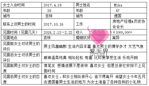 ⛎ 还记得1月份英国的男士George特意飞到女士家乡看女士,这让郝女士体味到了和西方男士真实生活的感觉。女士还有更多的男士将见面,她在对比和选择,在2月13日又迎来了来自德国47岁的Mika。有了上一次与西方男士相处的经验,这一次郝女士与Mika的相处把握拿捏得当,也很用心。六个月时间让两颗心靠的很近,男士博学多才,是一个历史协会的会长另外也是地产公司管理层,业余时间还参加了打鼓训练社团,是郝女士眼中有生活情趣、有文艺范、会生活的男人,6个月时间里她们把爱、思念、热情融进了每一封信里,终于等到了情人节的见面惊喜!