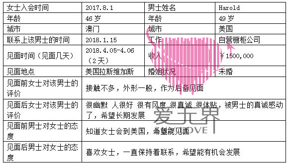 在美国有两位男士与Karen一直稳定交流着。3月份Karen给自己计划了一趟美国之行,这趟去美国会约见2位男士,同时也和远在美国求学的女儿见面。缘分真的是很奇妙的,Karen这一趟过去原本最希望好好相处的男士,却因一些突发情况没能顺利约见。于是原本被Karen放在第二位的男士Harold却在这种情况下意外的获得了女士的"重点关照",Karen把主要的心思都放在了与Harold的见面约会上。两人在女士出发美国前半个月已经商量好见面的时间和地点,Harold也为此早早订了拉斯维加斯的酒店和机票,期待着早日见到这位在自己心里有着甜美笑容的东方女士。