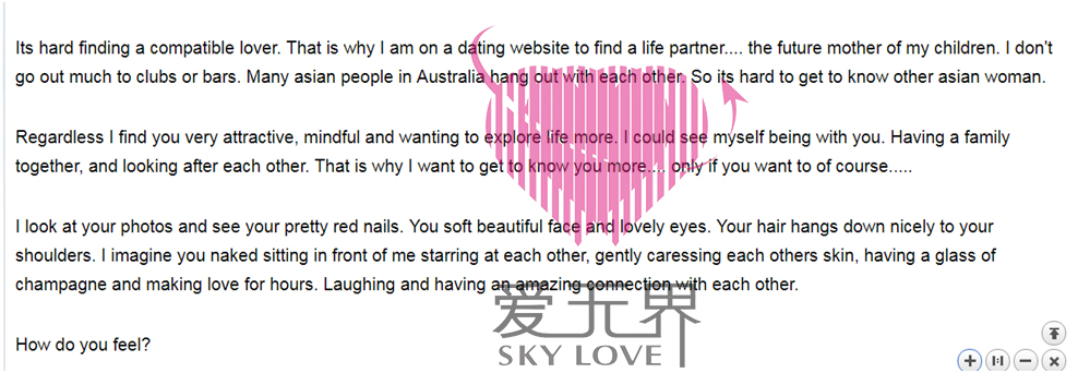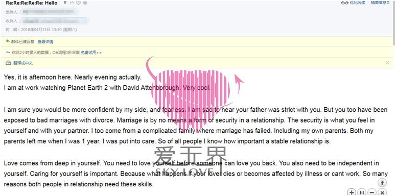 📖 备注:该男士名字叫Kai,37岁,来自澳洲,男士是做医疗工作的。女士来自云南,是一位非常美丽温柔的女人。男士是一个很开放,懂得为女士着想的男人。双方的想法很契合,都想要一个家庭,想要生自己的小宝宝。每天的来信彼此间都会分享互相对爱情的想法,男士看出女士在情感上的不安全感之后也主动说他也认为婚姻是很重要,并且确信女士在他身边会变得更有安全感,更加无惧。