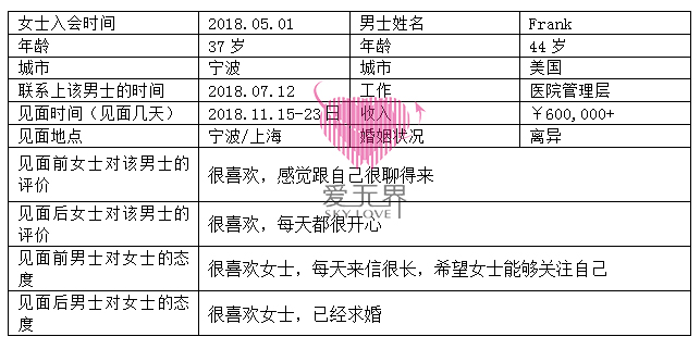 ꧂ 在Daisy和服务团队的共同努力下,我们在茫茫人海中找到了来自美国的Frank,一条简短的讯息开启了两个人此生的缘分。44岁的Frank与Daisy有很多的共同话题,总是聊得很投机,让两个初相识的陌生人之间少了很多陌生感。Frank每次的信件,诚恳又细腻,聊到自己的生活他总是显得那么的平静,透着生活的恬淡;聊到感情他总是时而忧伤、时而向往、时而就那么静静的通过视频看着Daisy,好像在说“就是你”。
