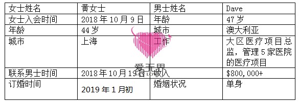 爱无界教练寄语:经历了无数次失落,也经历了无数次惊喜,黄女士终于和Dave牵手走向幸福的婚姻道路,爱无界祝福他们!从黄女士的案例,我们也可以看到,很多时候,女士们注重眼缘很正常,但也不要第一时间就去否定男士,否则很有可能就因此错过一段佳缘,有些男士的照片没有视频上好看,视频也没有现实中好看也是正常,因为西方人的五官较为立体却不上相,也不会去使用美颜相机拍照。其次就是对经济情况的了解,因为中西差异,也肯定会造成一些误解,这需要每一位入会的姐妹用心去体会去观察。