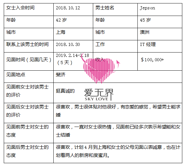 🔯 11月底的时候,男士就迫不及待想到上海和女士见面,因为他感觉,这样完美的一个女人,如果他不好好抓住,自己就没有机会了,因为爱上你,所以喜欢你的所有,愿意好好珍惜你,把你当成全世界最好的女人,或许这便是情人眼里出西施,男士的珍视感动了女士,但女士在国内还有事情办理,所以和男士商量把见面时间延迟到2月份在斐济见面。