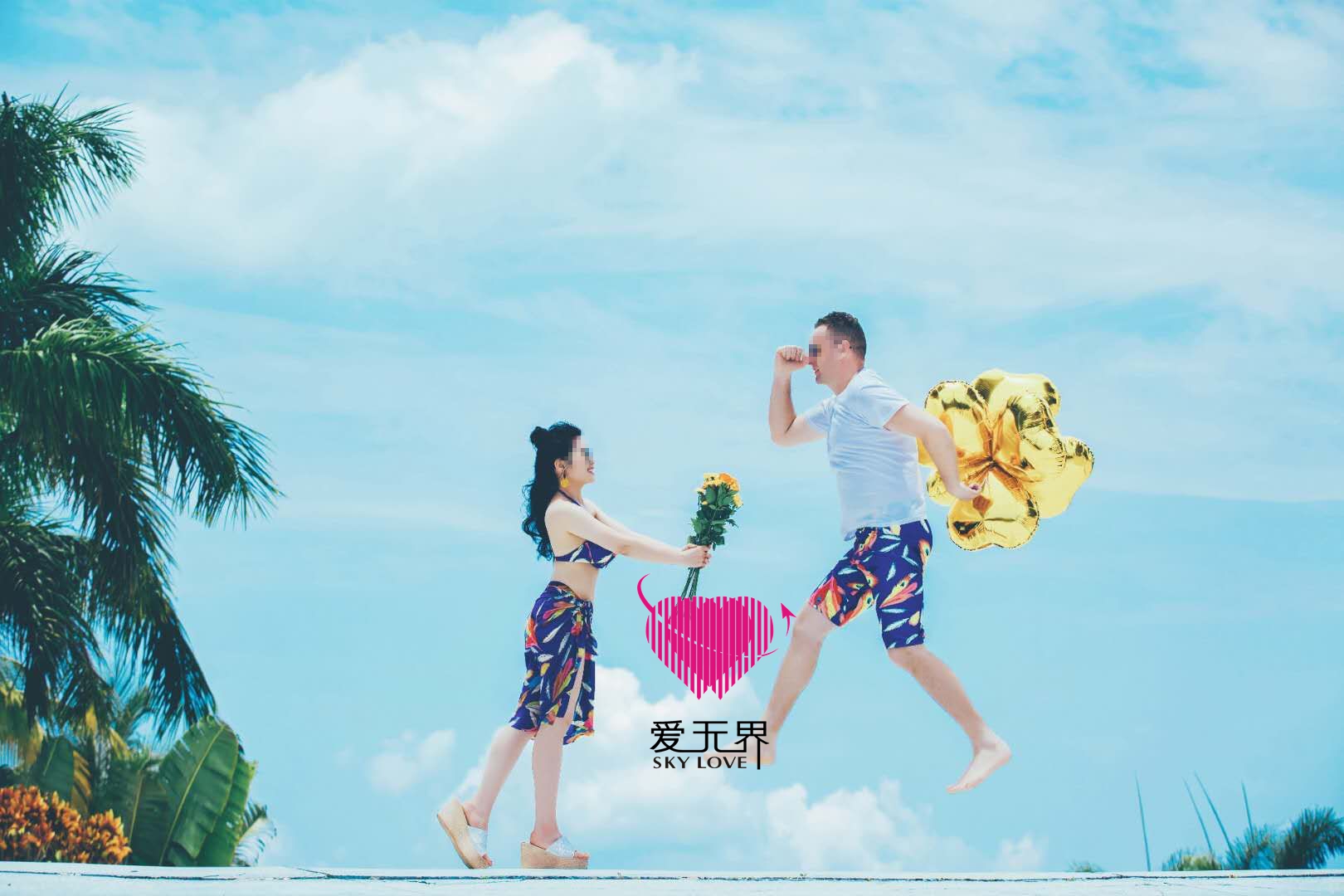 ♛偶尔他们也会拍一些调皮的照片,在纯白的蓝天背景墙下,男士摆出搞怪的动作,王女士则拿着金色花朵迎向男士,在自己心爱的人身边,他们都非常放松自然,展现出自己最纯真的一面,做着小孩子才会做的事情。