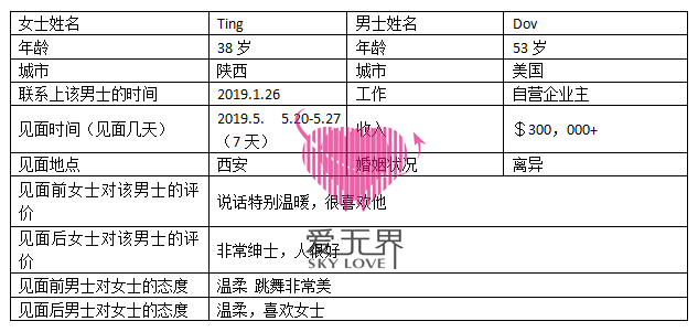 刚开始的时候,是Dov主动在平台上给Ting发送信息的,也就是在那时候开始,Ting和Dov彼此交换了微信,通过每天的聊天,两人日渐了解,感情升温,很快就进入热恋状态,然而,因为时差的关系,他们每天只有5分钟的时间去分享彼此的生活,聊的太晚Dov会担心影响Ting的睡眠。从这些细节上就看得出Dov真的很喜欢Ting,关心着她的一切。