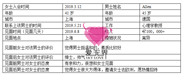 爱无界服务组把男士资料给到Dora的时候,她独到的眼光也感受到Allen是个非常绅士的男士,条件不错,她想好好把握住他。在微信交流时,两人每天分享彼此的生活,在一个愉快的感受下,他们对彼此有了一个更深的了解,Dora发现,原来和西方男士聊天是一件很有趣的事情,在交流的过程中互相探讨不同的文化,在思维碰撞中擦出不一样的火花,这是一次很独特的经历。