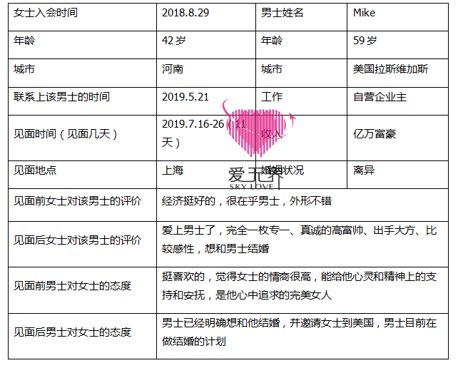 6月1日,服务组推荐了美国的Mike给Dora。Mike有5家公司,每间公司各自有CEO帮他管理,同时,他还是当地有名的社会名流,身家非常富裕。