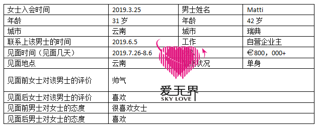 🐭 Matti从未来过中国,需要过来见女士的话就要先办好签证,爱无界服务组一五一十地告诉男士办理签证要准备的资料和信息,协助Matti顺成功拿到签证。跨国恋情的发展会遇到各种各样的问题,但是在爱无界的专业团队帮助下,一切都能迎刃而解。就这样,男士立刻定了来中国的航班和酒店,他们都很期待见面的那一天。