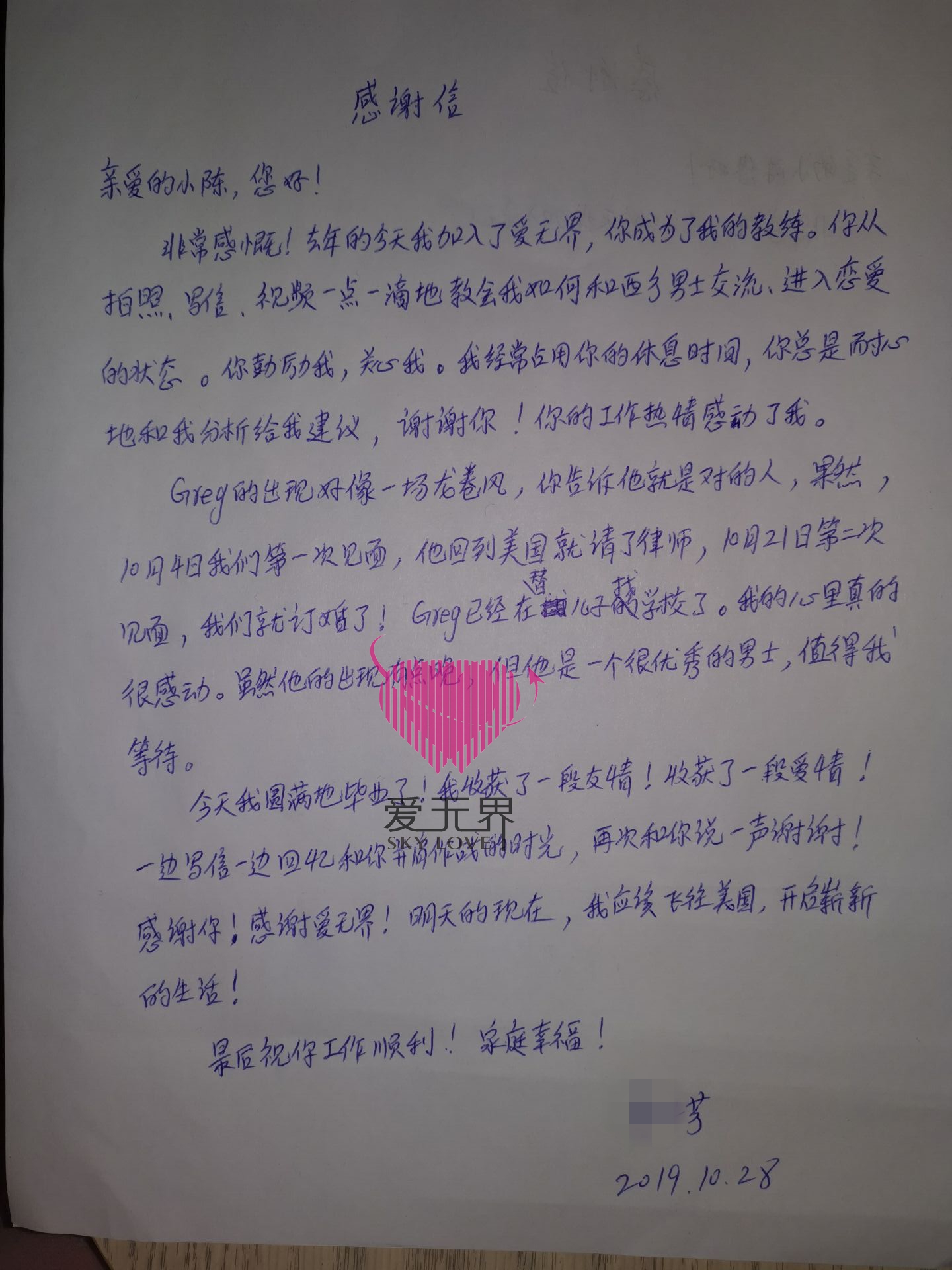 非常感慨!去年的今天我加入了爱无界,你成为了我的教练,你从拍照、写信,视频一点一滴地教会我如何和西方男士交流,进入恋爱的状态。你鼓励我,关心我。我经常占用你的休息时间,你总是耐心地和我分析给我建议,谢谢你!你的工作热情感动了我。