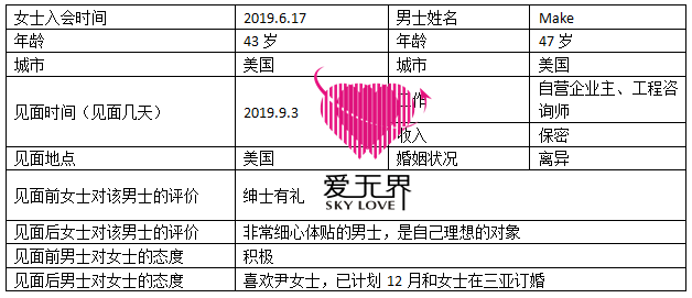 11月4日,X女士再次飞往美国,两人在拉斯维加斯浪漫相约,目前,男士正在办理中国签证,计划在12月和尹女士在三亚订婚!爱无界期待那一天的到来,也祝贺X女士成功牵手心仪的男士!