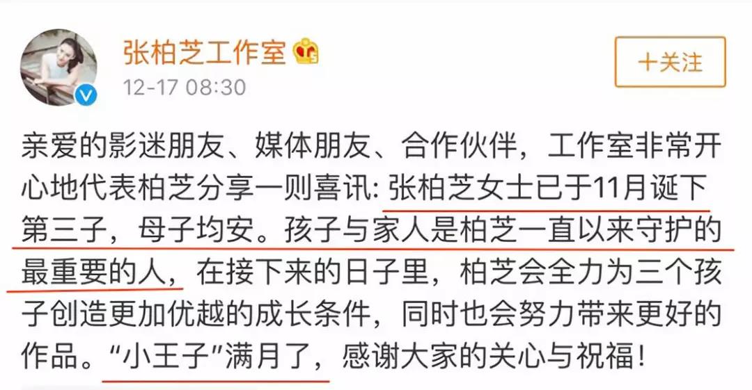 早晨八点半,张柏芝工作室宣布柏芝的第三个儿子“小王子”已经满月,母子均安。