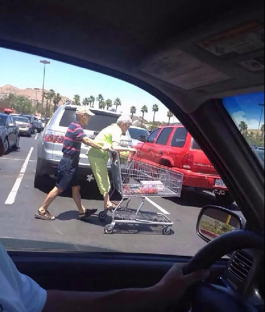 6.𒉰网友在车里偷拍到一幕甜甜甜的画面:奶奶童心未泯地站在购物车上,爷爷任劳任怨的在背后,轻轻推着小车前进。