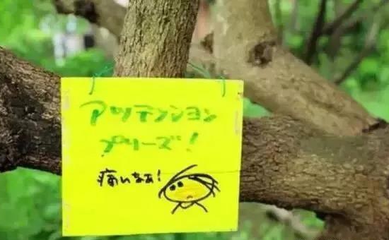低矮的树枝上写着:“请注意!会疼哦!”,提醒英子小心别碰到头。