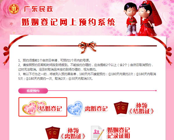 ﷽ 1.登陆广州市民政局官网//www.gdhy.gov.cn/,点击下边的“开始预约”选择“婚姻登记”相关事项预约即可。