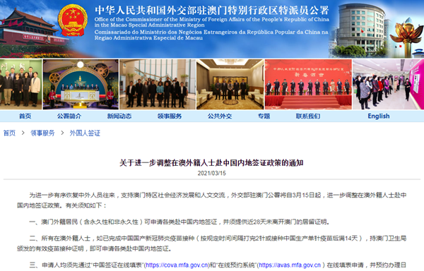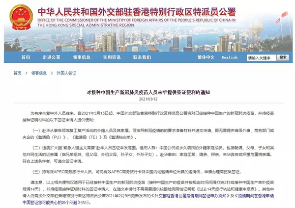 🔜 为有序恢复中外人员往来,自2021年3月15日起,中国外交部驻香港/澳门特别行政区特派员公署和中国驻外使领馆将对已经接种中国生产的新冠肺炎疫苗,并持疫苗接种证明材料的以下签证申请人提供便利: