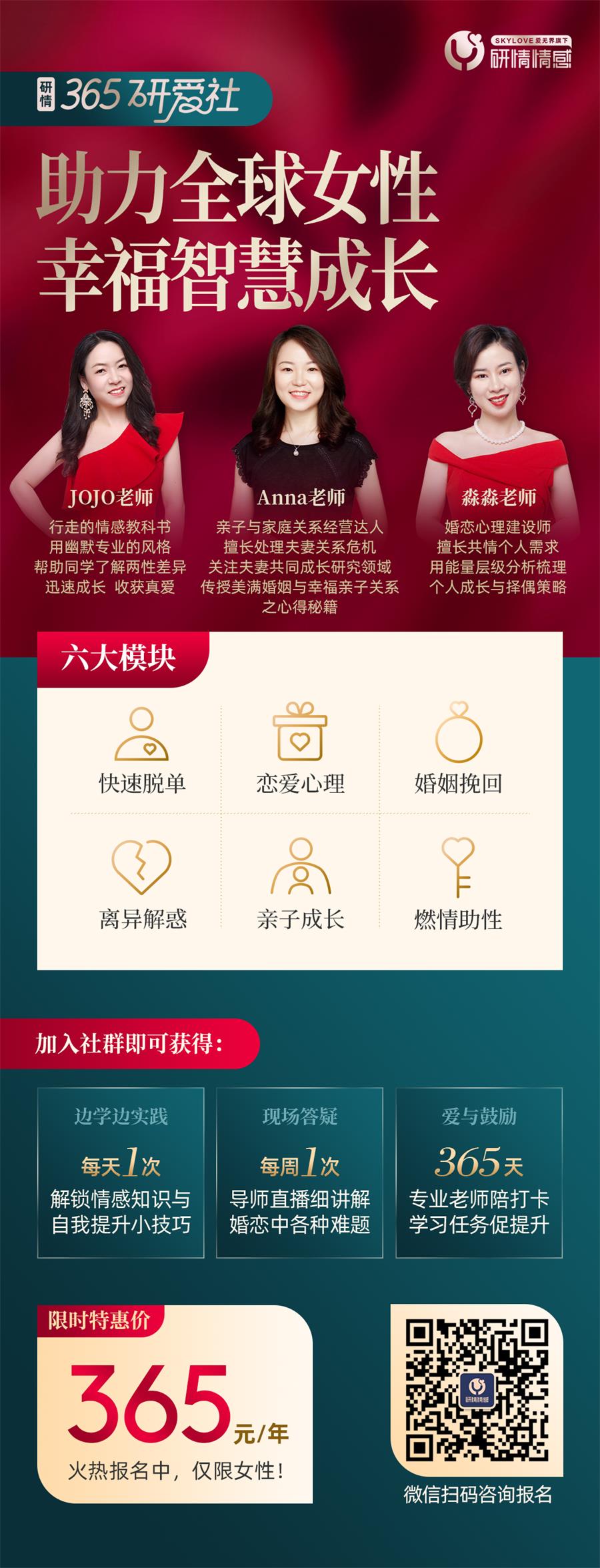 🎀研情365研爱社,现推出为期一年的情感课程,助力全球女性幸福智慧成长。 课程分为六大模块,包括:快速脱单、失恋疗愈、情感修复、婚前排雷、离异解惑和燃情助性,覆盖了婚恋当中你能想到的一切问题。 进入社群的姐妹,可以每天解锁一项情感技能,边学边在生活中实践;每周有一次导师直播,现场答疑,干货满满;还有长达一年365天的专业老师陪伴,输入源源不断的爱和鼓励,为姐妹们养成打卡学习的好习惯,实现自我提升。
