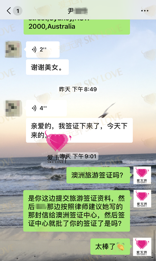 在ꦇ2022年的4月13日,爱无界就给尹女士发了签证申请相关的,尹女士马上就去提交了澳洲旅游签证申请。4月25日,距离提交仅10余天,尹女士的澳洲旅游签证就获批了。这对有情人非常行动派,当下就买好了6月15日的机票飞悉尼团聚。
